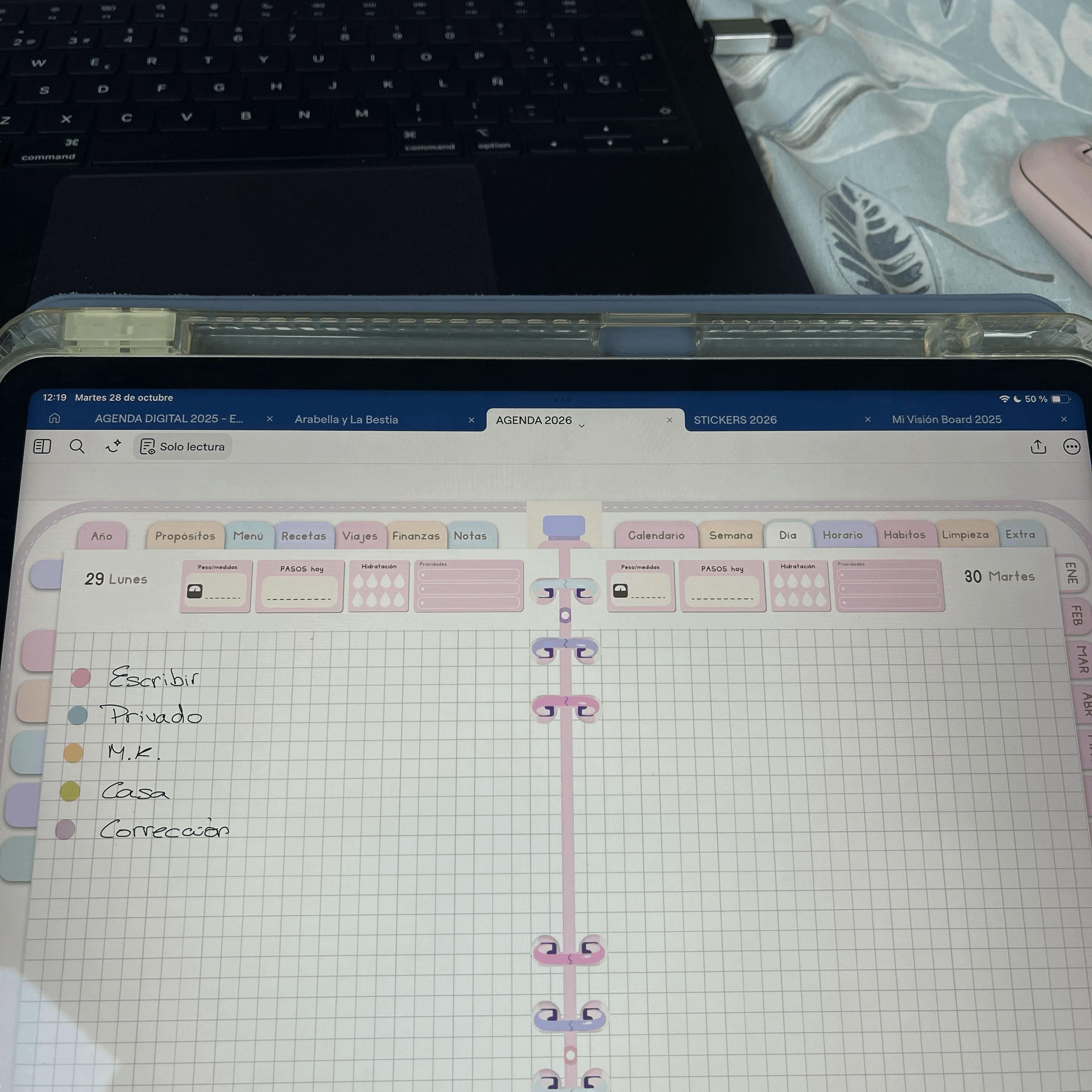 AGENDA DIGITAL MINIMALISTA PRO 2026 con vista mensual, semanal y día. Incluye curso, tutoriales, stickers y recursos extra. Edición pastel