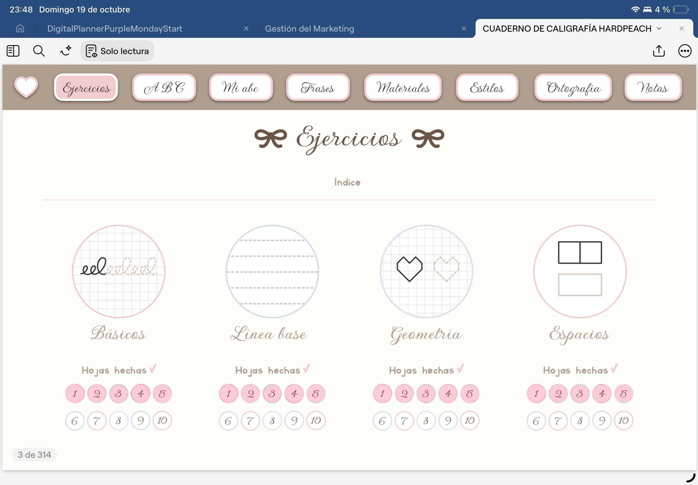 📝 Cuaderno de caligrafía digital con múltiples ejercicios y prácticas que podrás repetir tantas veces como quieras para mejorar tu letra y trazos.