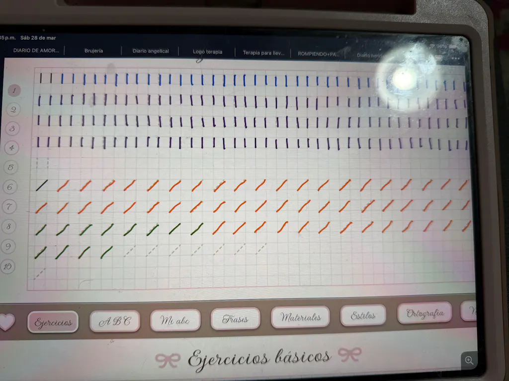 - 📝 Cuaderno de caligrafía digital con múltiples ejercicios y prácticas que podrás repetir tantas veces como quieras para mejorar tu letra y trazos.