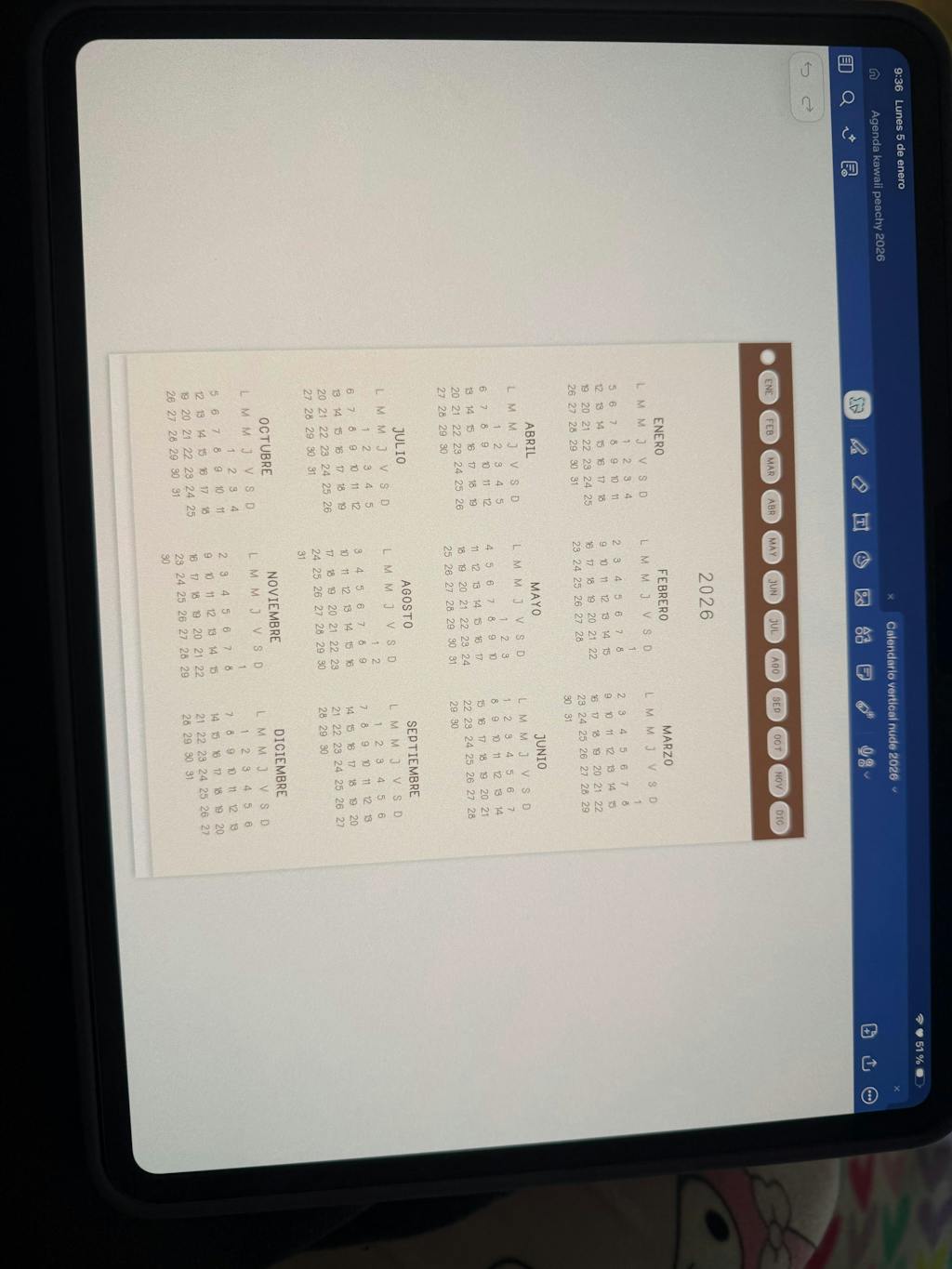 Cada mes está fechado y estructurado en formato vertical, lo que te permite ver tus planes y eventos de arriba abajo con total orden: perfecto para anotar citas, entregas, proyectos, rutinas y cualquier detalle importante. Además, incluye accesos rápidos para cambiar de mes con un solo toque, haciéndolo muy cómodo para usar en iPad, tablet, teléfonos u otros dispositivos.