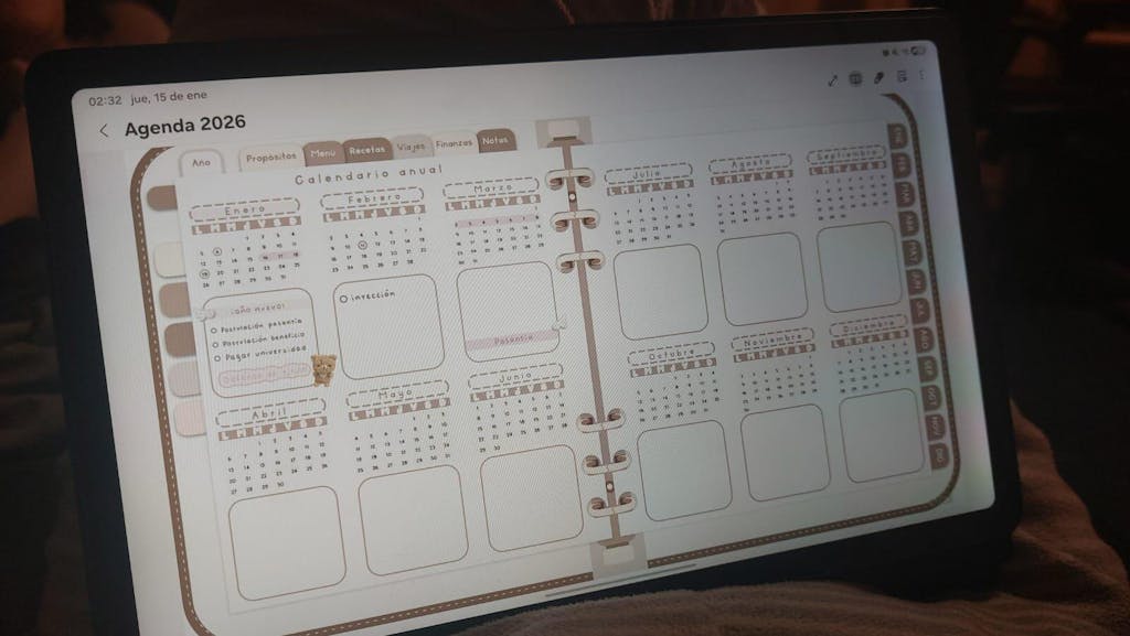 - Pestañas de acceso rápido: cada sección de la agenda está enlazada con pestañas interactivas para que puedas moverte fácilmente entre meses, vistas y apartados sin perder tiempo.