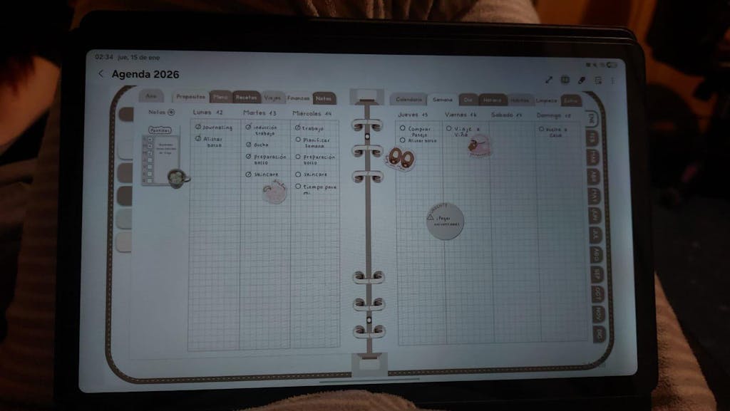 Además, la agenda incluye contenido extra para acompañarte: recursos descargables, colecciones de stickers digitales y acceso al curso en vídeo incluido, con ideas y consejos para sacarle el máximo partido y mantener la motivación sin presión.