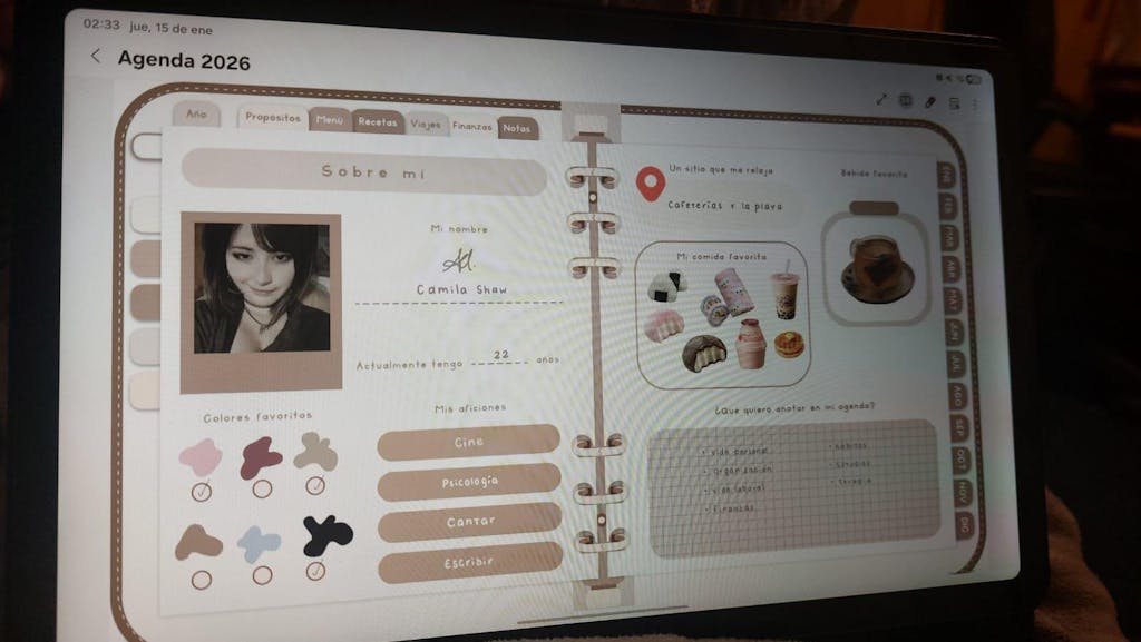 - Sección "Sobre mí": comienza con una página para reflexionar sobre ti, tus prioridades, y qué quieres trabajar a lo largo del año.