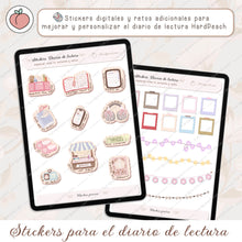 - Colección adicional con diferentes retos que podrás añadir al diario de lectura y stickers adicionales para personalizar aún más el estante y secciones del del diario de lectura digital HardPeach. Puedes verlo en detalle aquí