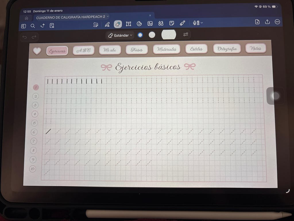 - 📝 Cuaderno de caligrafía digital con múltiples ejercicios y prácticas que podrás repetir tantas veces como quieras para mejorar tu letra y trazos.